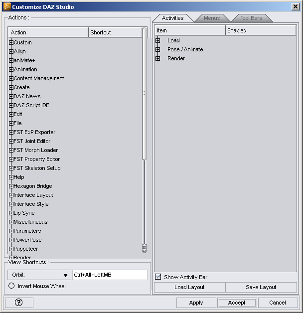 How to Add a command to the Main MenuHere's a quick guide to how to add plugin menu items to your DAZ Studio main menu. Most plugin commands won't automaticlly appear on your menus, you must add them by hand. To do this open the Customize dialog with Edit->Customize or press F3 to bring up this dialog: